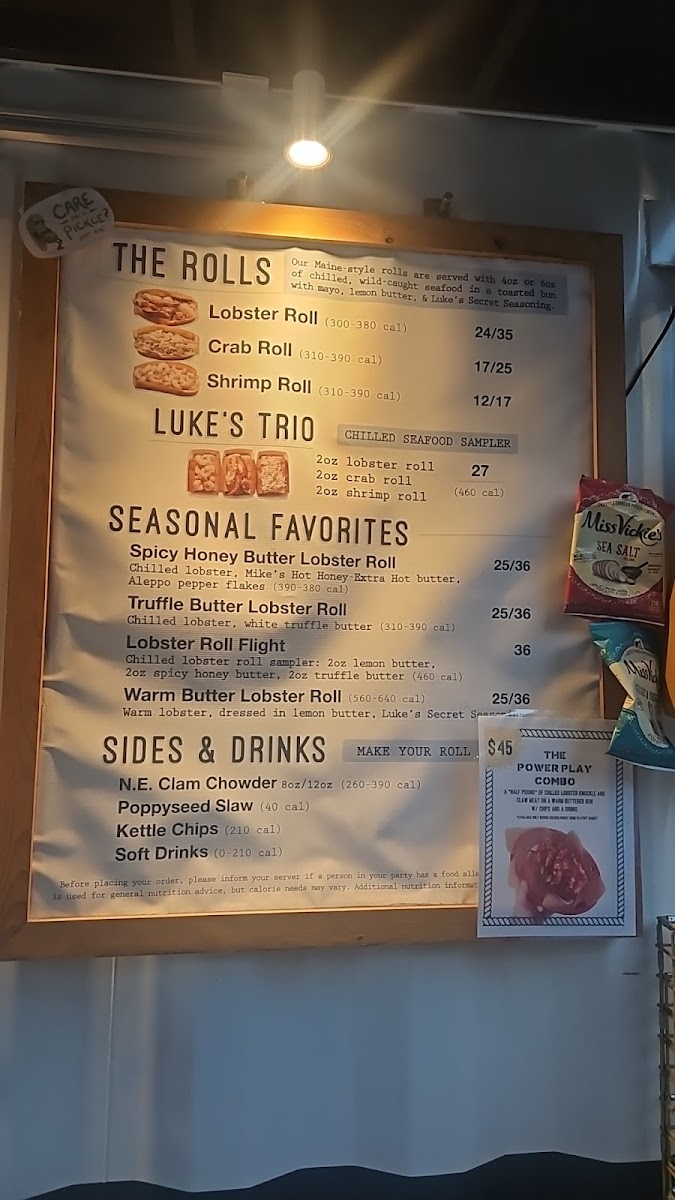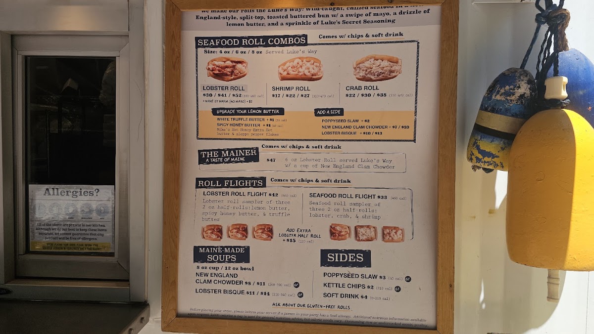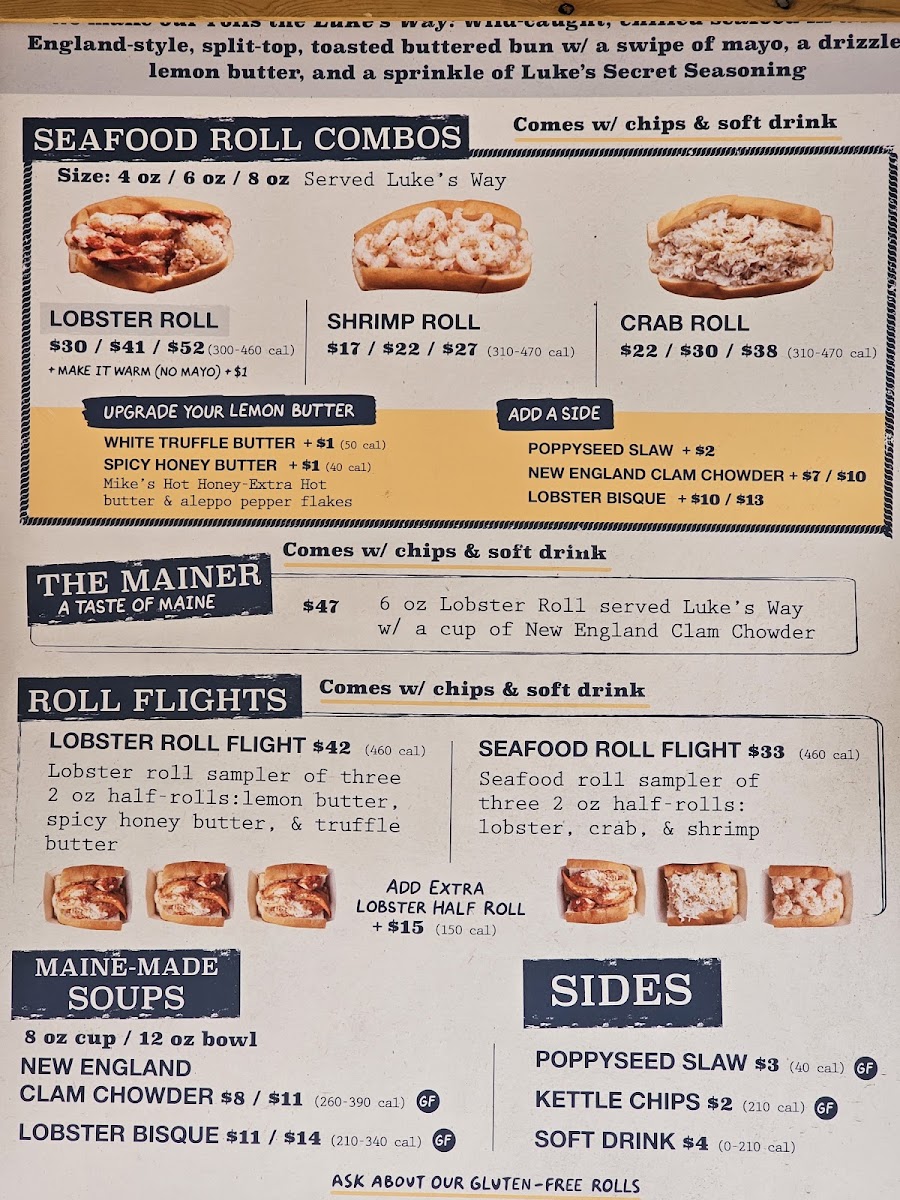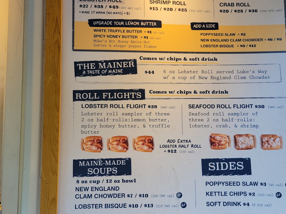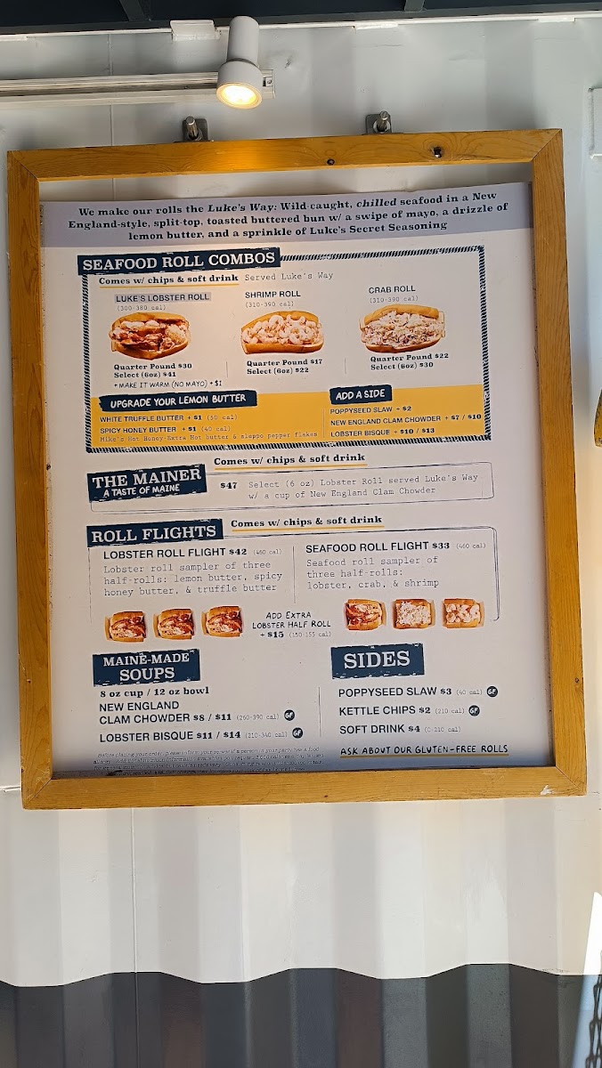 Luke's Lobster offers a variety of fresh seafood options that transport you straight to the coast of Maine. Their Lobster Roll Flight and Seafood Roll Flight allow diners to sample a selection of their most popular rolls, while the Lobster Roll, Shrimp Roll, and Crab Roll are available in individual servings. If you're looking to upgrade, consider adding Lemon Butter for an extra burst of flavor. For a true taste of Maine, the The Mainer is a must-try dish. To complement your roll, you can add a side like the rich Lobster Bisque, the creamy New England Clam Chowder, or the tangy Poppyseed Slaw. For those craving something more casual, sides such as Kettle Chips and refreshing Soft Drinks are available. Little diners can enjoy smaller portions with the Kid's Grilled Cheese, Kid's Lobster Roll, Kid's Shrimp Roll, or Kid's Crab Roll. With a menu packed with Maine-inspired classics, Luke's Lobster provides a satisfying seafood experience that caters to all ages.