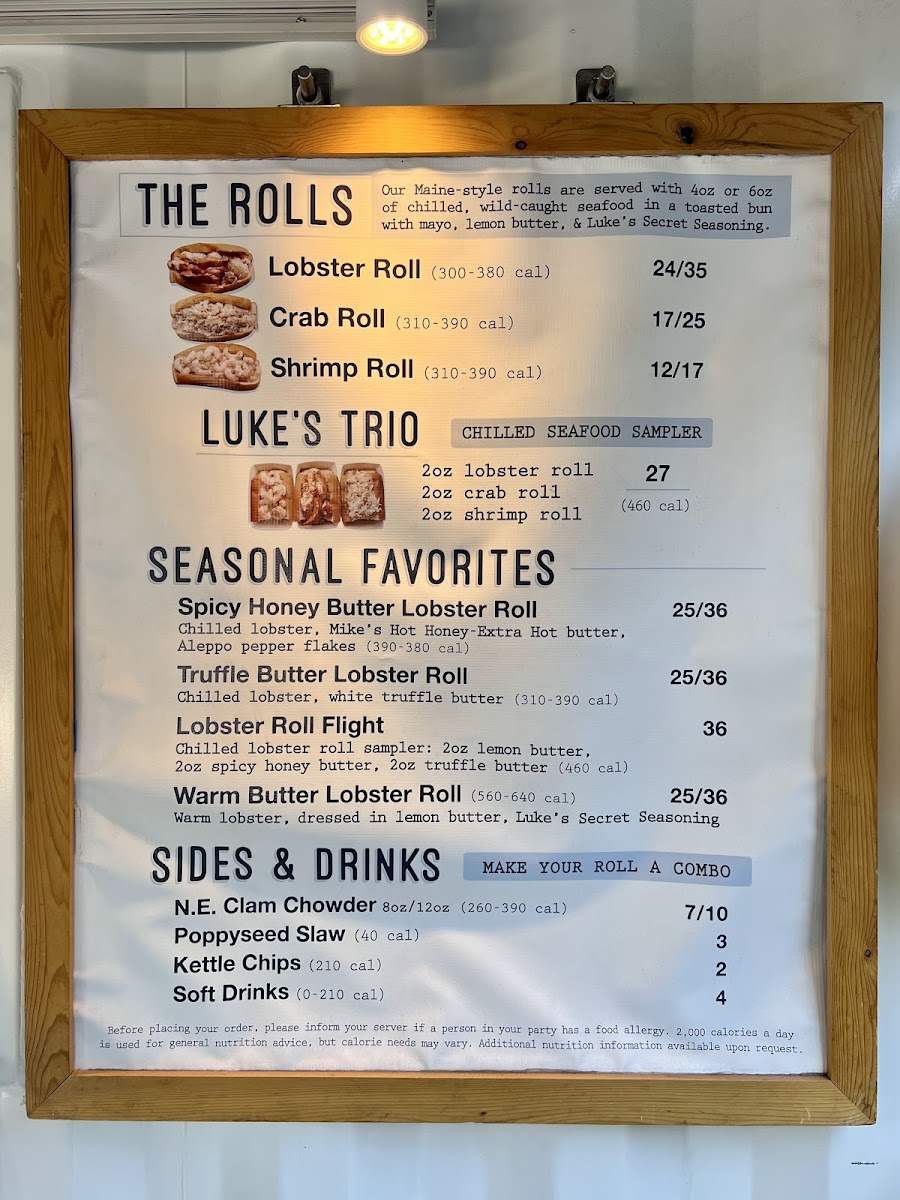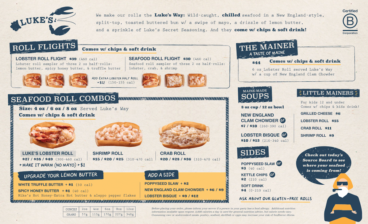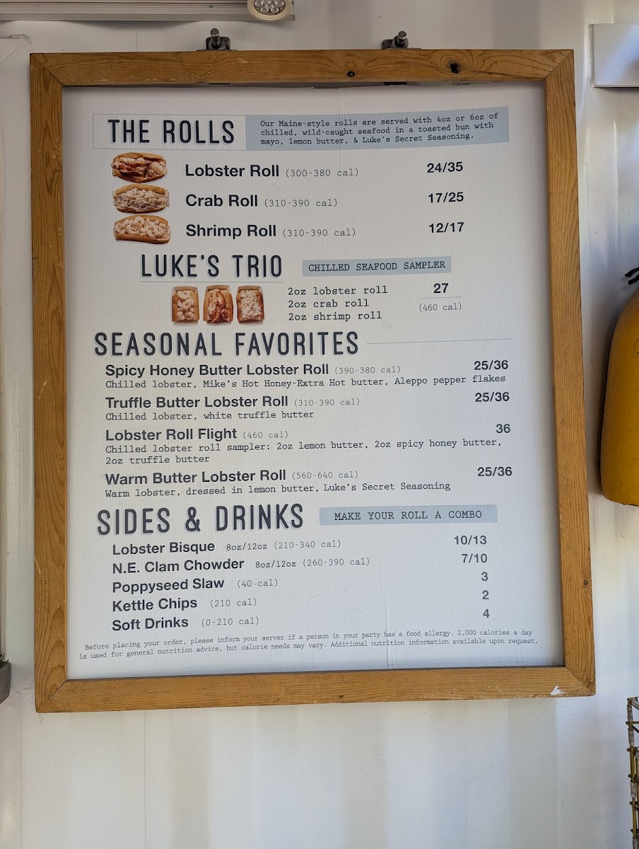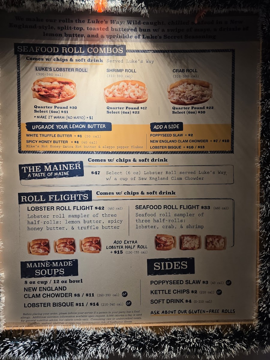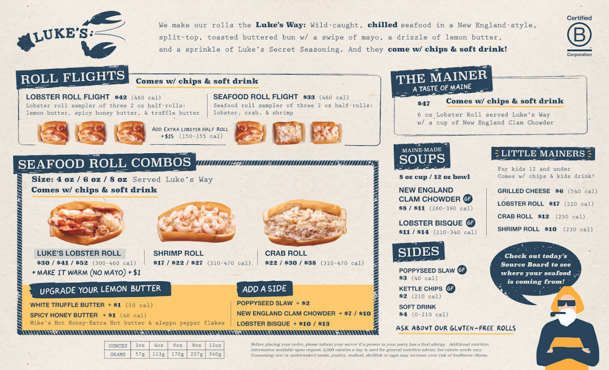 Luke's Lobster offers a variety of fresh seafood options that transport you straight to the coast of Maine. Their Lobster Roll Flight and Seafood Roll Flight allow diners to sample a selection of their most popular rolls, while the Lobster Roll, Shrimp Roll, and Crab Roll are available in individual servings. If you're looking to upgrade, consider adding Lemon Butter for an extra burst of flavor. For a true taste of Maine, the The Mainer is a must-try dish. To complement your roll, you can add a side like the rich Lobster Bisque, the creamy New England Clam Chowder, or the tangy Poppyseed Slaw. For those craving something more casual, sides such as Kettle Chips and refreshing Soft Drinks are available. Little diners can enjoy smaller portions with the Kid's Grilled Cheese, Kid's Lobster Roll, Kid's Shrimp Roll, or Kid's Crab Roll. With a menu packed with Maine-inspired classics, Luke's Lobster provides a satisfying seafood experience that caters to all ages.